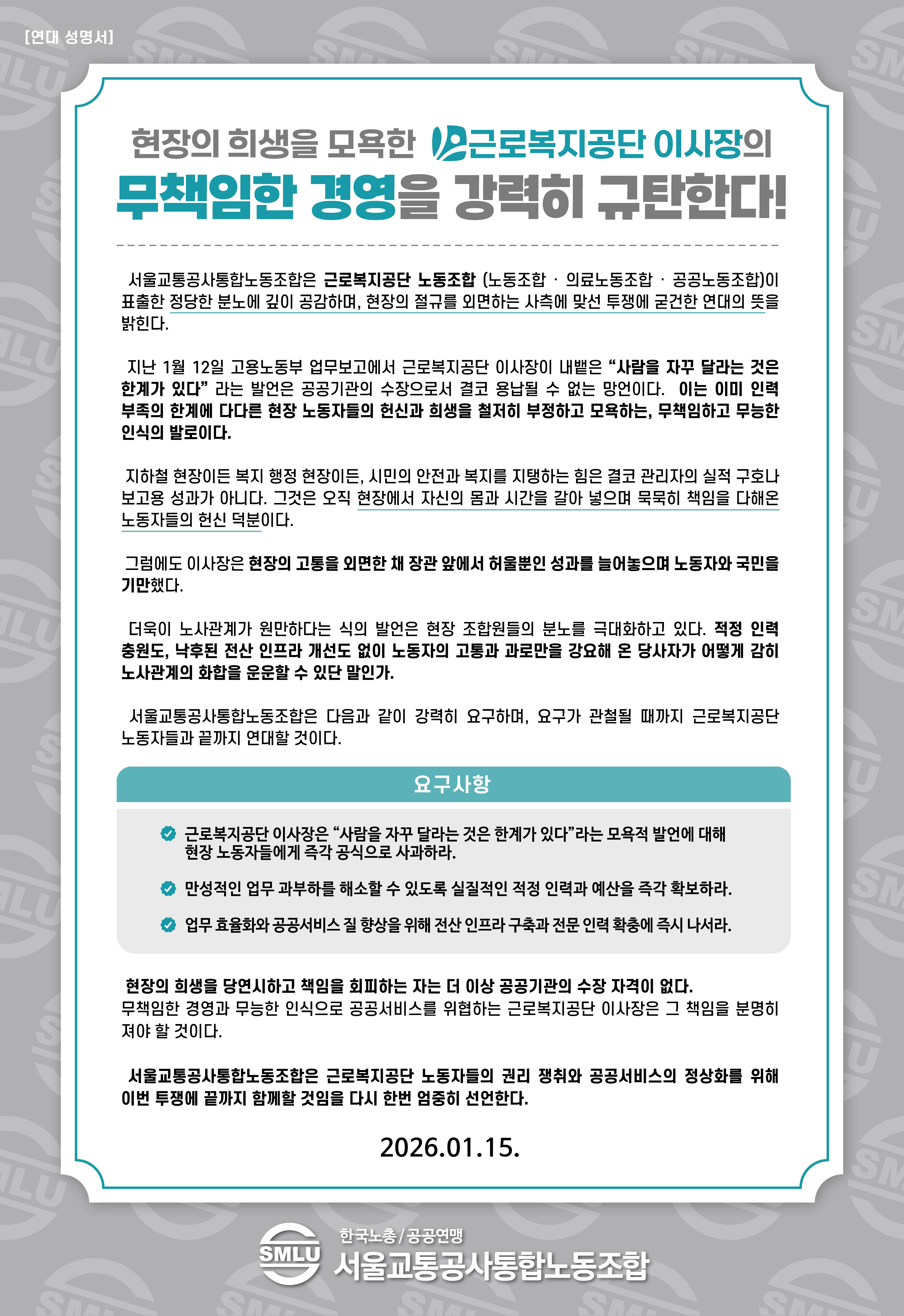 [연대 성명서] 근로복지공단 이사장의 무책임…
