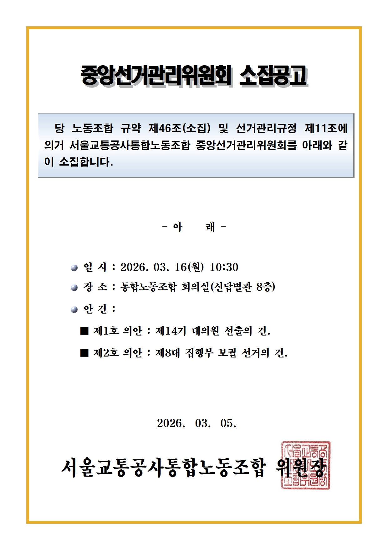 [공 고] 중앙선거관리위원회 소집 안내