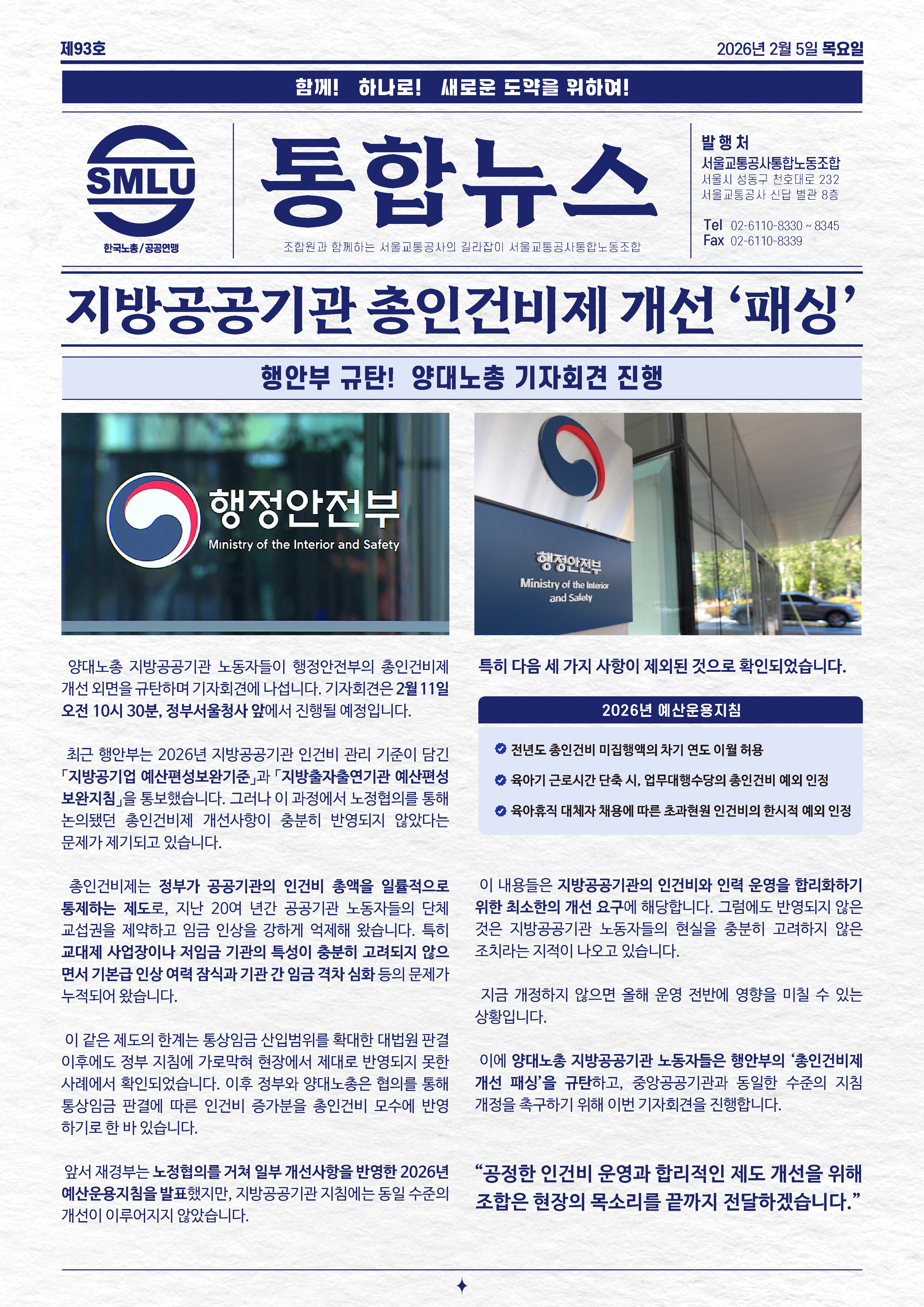 [통합뉴스 제93호] 지방공공기관 총인건비제 개선 '패싱'