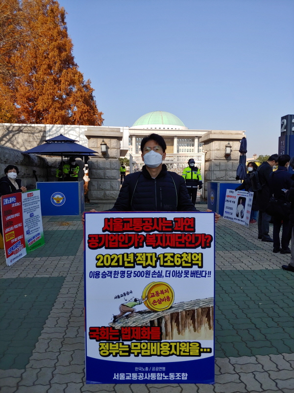 노동조합은 공사의 재정위기 극복 및 재정 정상화를 위하여 정부 및 국회 그리고 서울시에 공익서비스 비용 손실 보전 등을 요구하는 1인 시위를 국회 앞에서 실시했습니다.
