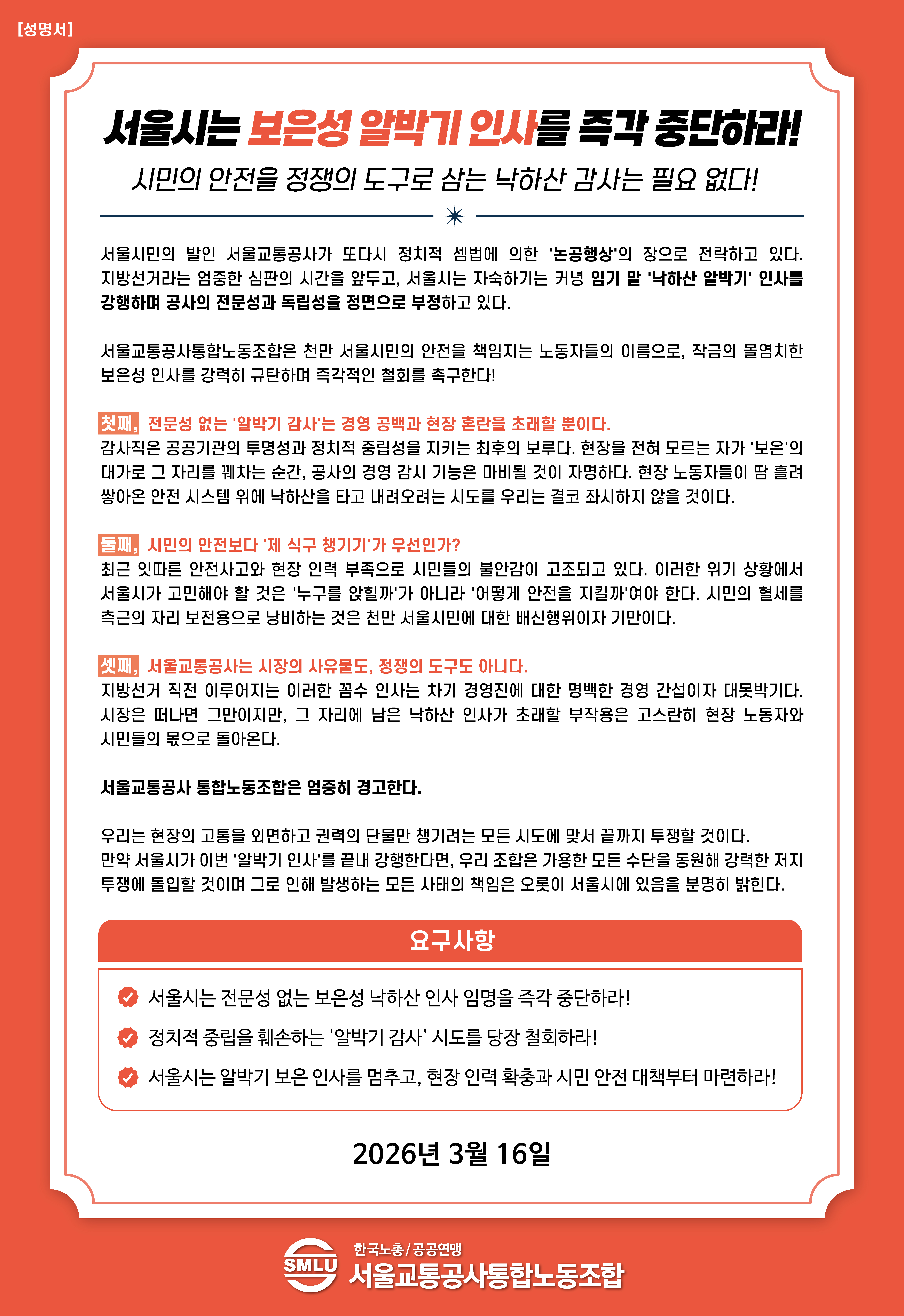[성명서] 서울교통공사 사장 임명을 즉각 중…